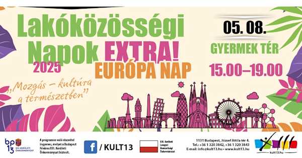 Minden év májusában megünnepeljük az Európa-napot, mely az európai békét és egységet állítja reflektorfénybe. Ezért a lakóközösségi napok ezen helyszínén színes mazsorett bemutatót követően szeretnénk ebből az alkalomból betekintést adni a népek kultúrájába, szokásába. Európai országok asztali és szabadtéri játékaiba kapcsolódhatnak be a jelenlevők, az Angyalföldi Vadrózsa család májusi népszokásokat ismertet, majd táncol a nézőközönség bevonásával. Az EU soros lengyel elnöksége alkalmából a kerületi lengyel nemzetiségi önkormányzat Jagelló Izabella és családja lengyel történeti kiállítással és a régi lengyel filmzenéket játszó - Medovina Kvartett zenés műsorral járul hozzá az Európa naphoz. A programot követően minden érdeklődött szeretettel várunk a XIII. kerületi Nemzetiségek Házában, ahol nyílt rendezvény keretebén lengyel Ízek mellett folytatjuk a zenész műsorunkat.